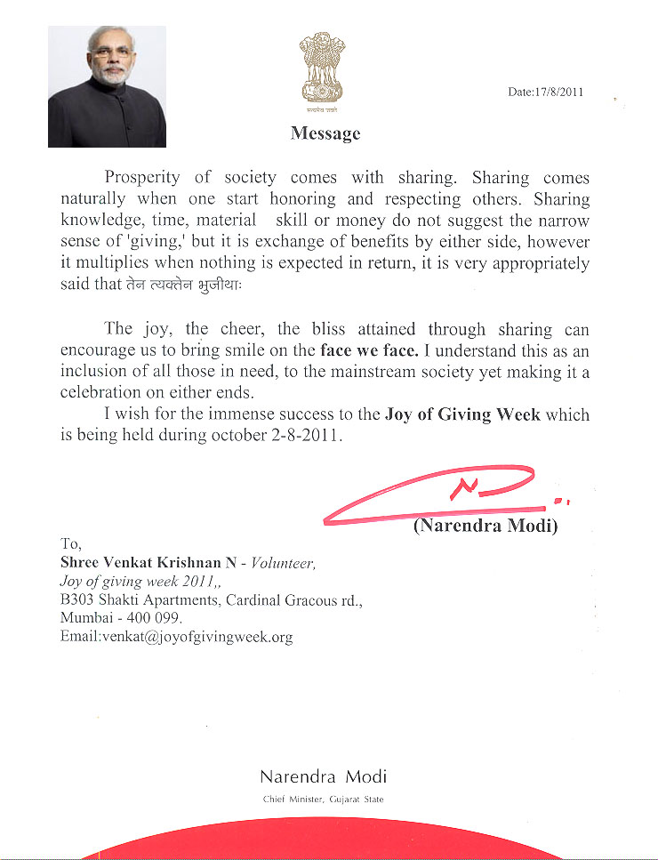 Endorsements for JGW 2011 have begun to come in from many sources and this year, the Chief Ministers of 3 important states have written appreciating the JGW and exhorting citizens to participate wholeheartedly and willingly in 'giving activities' during JGW '11. As Mr.Narendra Modi says, " The joy, the cheer, the bliss we attain through sharing can encourage us to bring a smile on the face we face." Mr.Chavan, the CM of Maharashtra, is encouraged that the JGW is organised by socially minded citizens and he is confident that "such voluntarily organised social functions will help society to strtengthen the bond of love and togetherness."